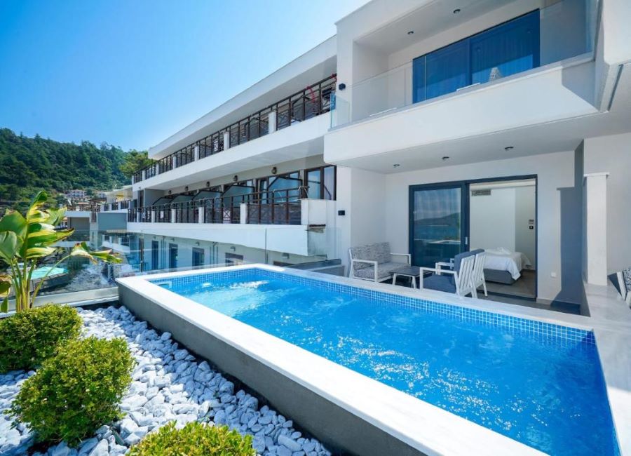 Aloe Elegant Suites se află în Skala Potamia și are vedere la mare, o piscină în aer liber sezonieră, o grădină, un lounge comun, o terasă și un bar. Acest aparthotel pune la dispoziție gratuit acces WiFi și parcare privată.