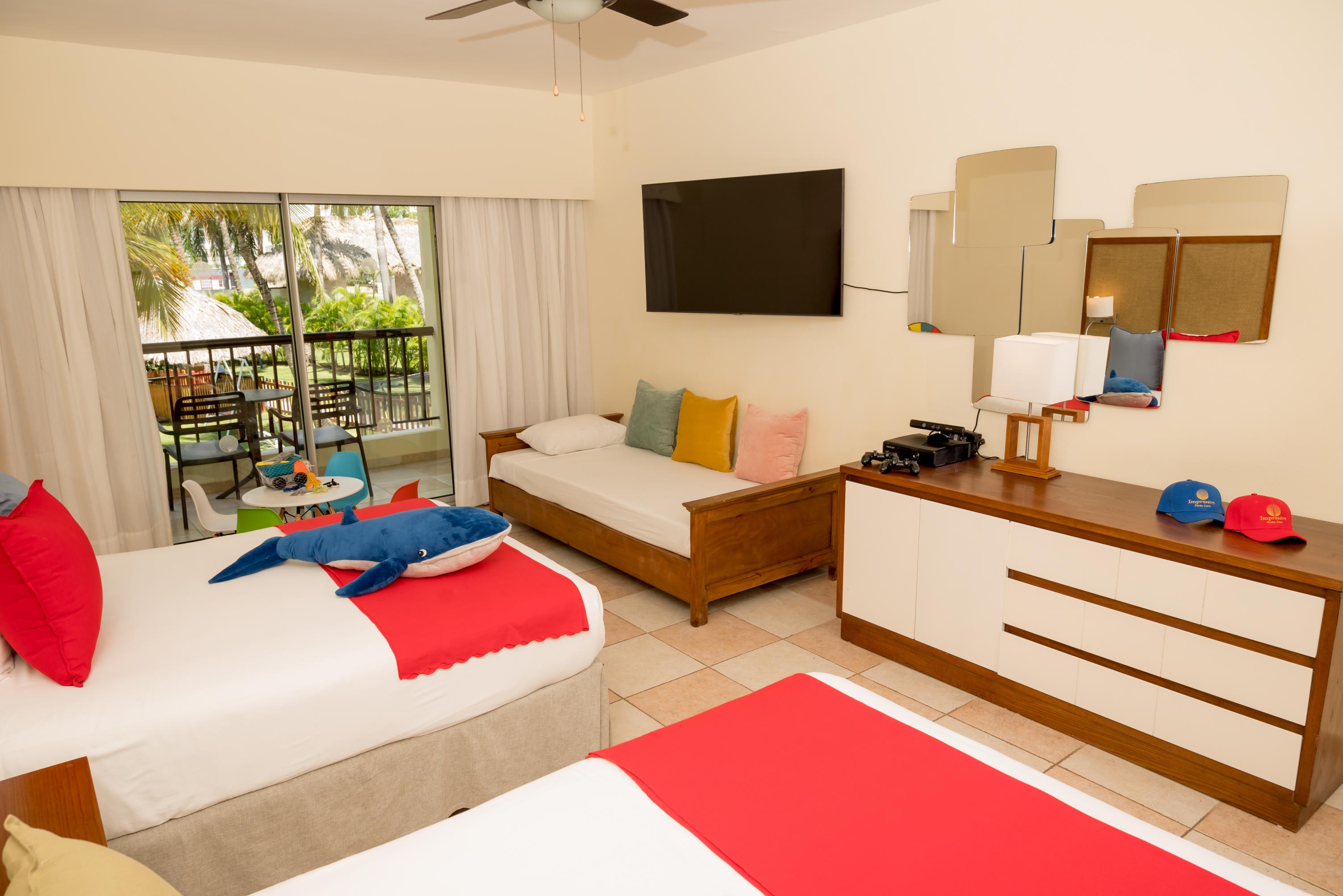 Family Room:Create unforgettable memories in one of our Family Rooms: two rooms joined by a connecting door with beautiful tropical views. Relax in a comfortable double room while the kids enjoy their own themed room with fun amenities. Welcome gift (cap, beach toy and stuffed animal), plush dartboard, childrens table and seat, bathrobe, toiletries, playstation, minibar with juice and cereals, are just some of the surprises the little ones will enjoy during their stay. In addition, we offer a full program of daytime and evening activities.